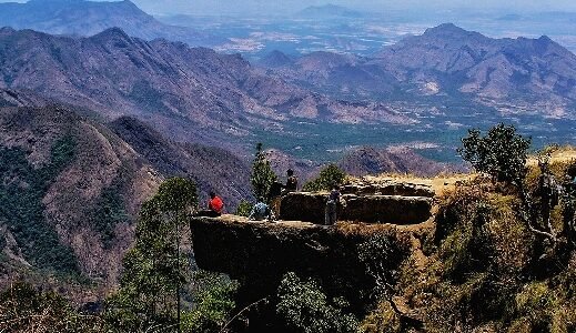 A dramatic cliff viewpoint resembling a dolphin’s shape, offering sweeping views of deep valleys, mist-covered hills, and thrilling trekking experiences.